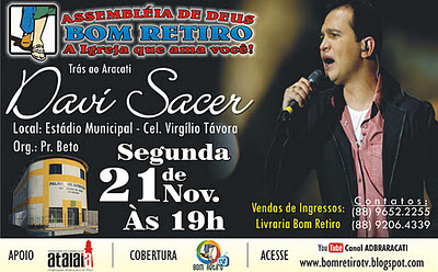 ESSE FOI MAIS UM GRANDE EVENTO REALIZADO PELA ASSEMBLÉIA DE DEUS BOM RETIRO - ARACATI , DEPOIS DE TRAZER MARA MARAVILHA , IRMÃO LÁZARO , MARCO AURÉLIO E OUTROS GRANDES NOMES DA MÚSICA GOSPEL NACIONAL , AGORA TROUXE MAIS UM GRANDE NOME , DAVI SACER . O ESTÁDIO MUNICIPAL FICOU LOTADO , O NOME DE JESUS FOI GLORIFICADO , VIDAS FORAM ALCANÇADAS . PARABÉNS PR. BETO , PARABÉNS ADBR !!!